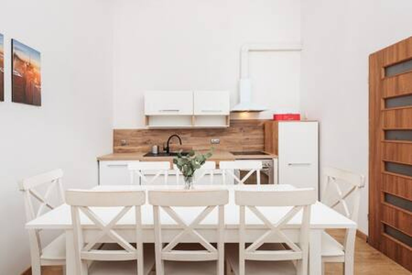 - kuchni z kuchenką, piekarnikiem, dużą lodówka, zmywarką i stołem.